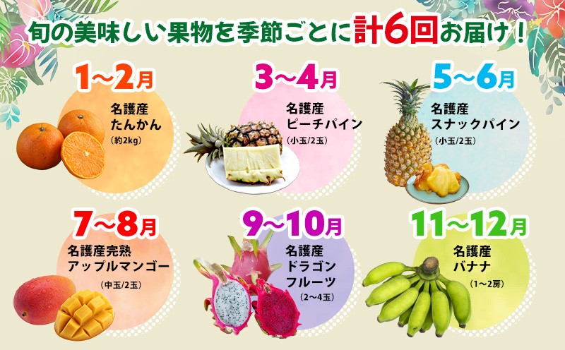 | 容量 | フルーツ定期便(6回コース) 【1~2月】名護産たんかん(約2kg) 【3~4月】名護産ピーチパイン(小玉/2玉) 【5~6月】名護産スナックパイン(小玉/2玉) 【7~8月】名護産完熟アップルマンゴー(中玉/2玉) 【9~10月】名護産ドラゴンフルーツ(2~4玉) 【11~12月】名護産バナナ(1~2房) |
