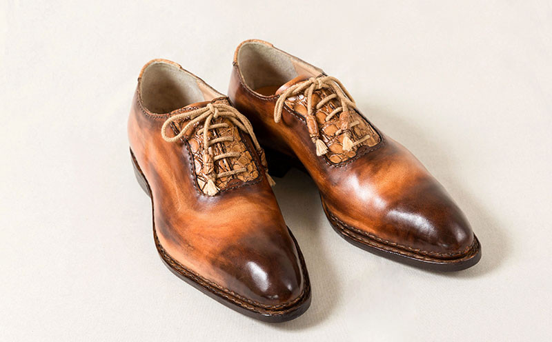 羽部分とかかと部分、また、靴紐の先にも天然クロコダイル革をあしらった贅沢な一足です。