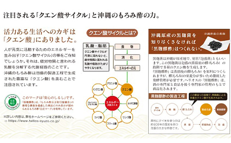 頼れる健康法がひとつほしい。 無理なく続けられる習慣があるといい。 みなさまのそんな気持ちに沖縄の蔵元ならではの健康酢があります。 発酵の匠が本気で造った“天然発酵”の健康補助飲料「黒麹醪酢(くろこうじもろみす)」 「まろやかな口当たりで美味しく続けられる」と全国のリピーターさんに支えられて23年。 ロングセラーの天然発酵クエン酸飲料です。