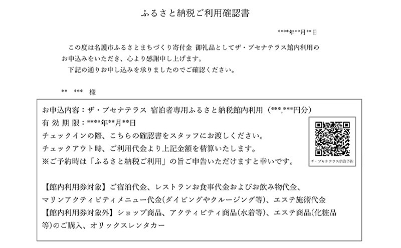 ザ・ブセナテラスへご宿泊されず、レストランやエステ等の施設利用の場合は各施設で利用可能な、1.000円単位の館内利用券を発券いたしますので備考へ【1.000円券希望】とご記入ください。