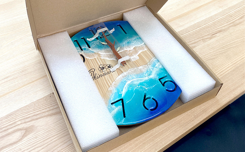 沖縄の海をコンセプトにレジンの輝きで表現するオーシャンアート。 掛け時計に描かれた沖縄のエメラルドグリーンのオーシャンアートはいつもそばで沖縄の海を感じていただけます。沖縄好きな方への贈り物などにもおすすめです。