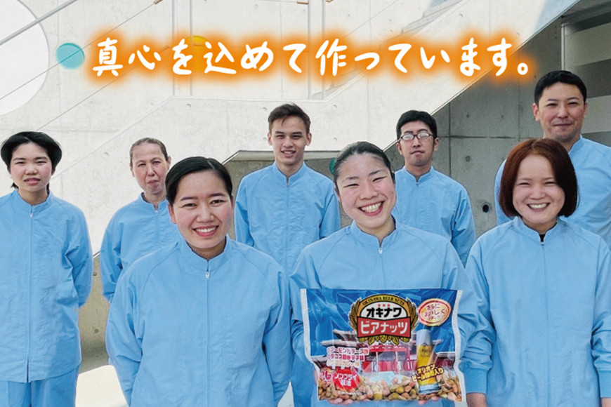 ビール製造時に出る副産物「ビール酵母」を沖縄そばに練り込めないかとのお声かけから生まれた商品。麺に練り込むと特有の香りと苦みがあり、開発は困難を極めましたが当時のサン食品の企画開発室では悩んだ末に、ビール酵母を混ぜた衣を落花生にコーティングした豆菓子(おつまみ)の開発へと方向転換。1999年「オリオンビアナッツ」の発売にこぎ着けました。発売当初は鳴かず飛ばずの商品だったが、2010年に今の味付け、小袋5連タイプ包装に変更してから火が付き、今では沖縄を代表するお土産の1つに成長しています。