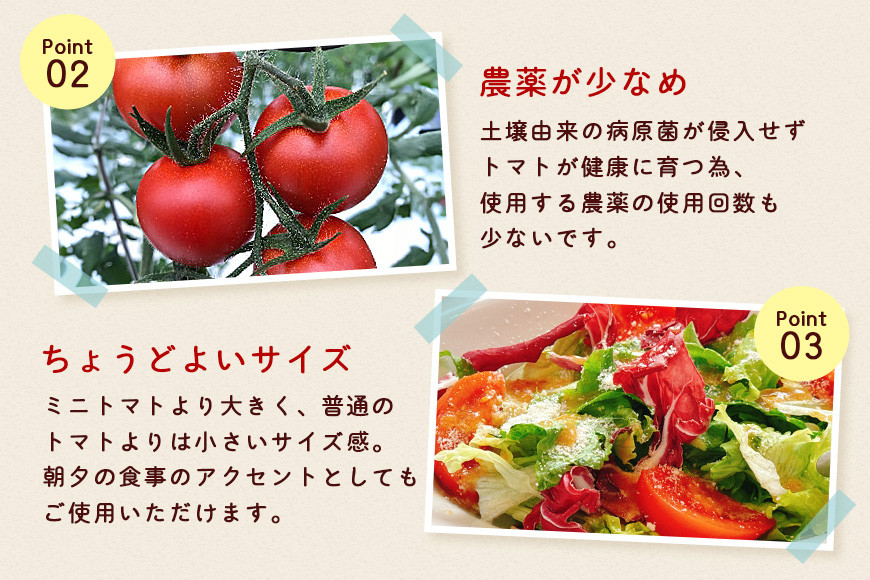 土壌を使用しない「フィルム栽培」で、土壌由来の病原菌が侵入せずトマトが健康に育つ為、使用する農薬の使用回数も少ないです。