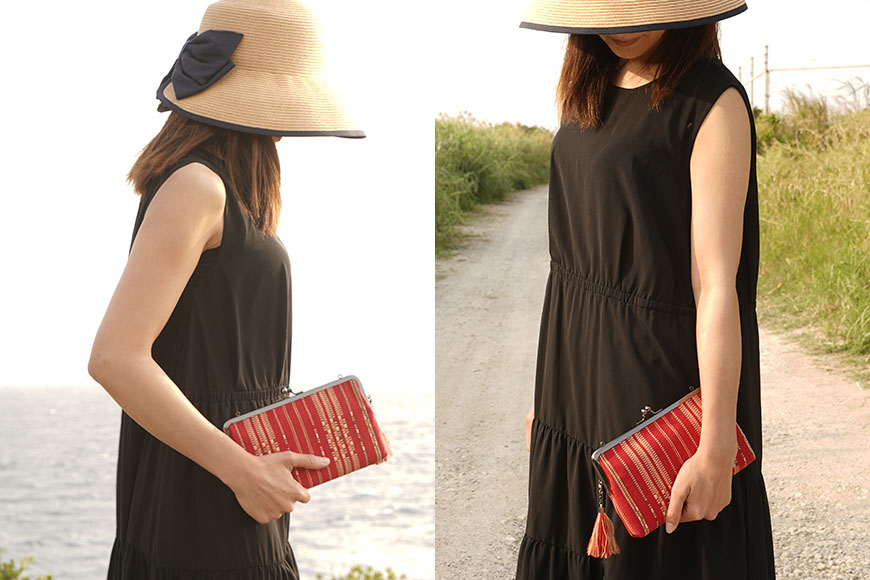 沖縄で伝統的な手織り技術を使って作られた首里の織物を使ったチェーン付きのがま口ミ
