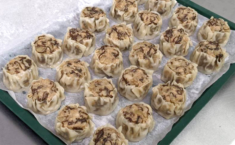 沖縄県産のブランド豚「あぐー」と、沖縄特産品の「もずく」がたっぷり入った、新食感が味わえる手包みシューマイです。