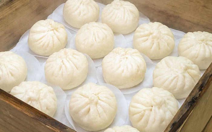 沖縄県産ブランド豚「あぐー」がたっぷり入った、お肉たっぷり具だくさんの手づくり豚まん。粗く挽いた豚肉は、あぐーの旨みとプリプリ食感を。