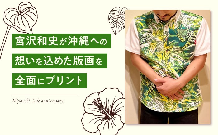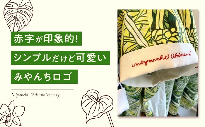「ヤママヤー」と、みやんちの庭でも元気に育つ沖縄の植物「月桃」が印象的な、ボタニカルなデザインのかりゆしウェアです。
