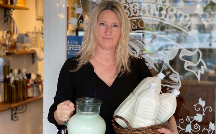 沖縄市のプラザハウス高台にあるCheeseanistaチーズ・ヨーグルト工房、もとギリシャ料理レストランLittle GREEK Kitchen®のオーナーシェフ、パメラが手掛けるギリシャのチーズ《マリネードリトルアイランドティリー》と《沖縄ヨーグルト》のセットです。