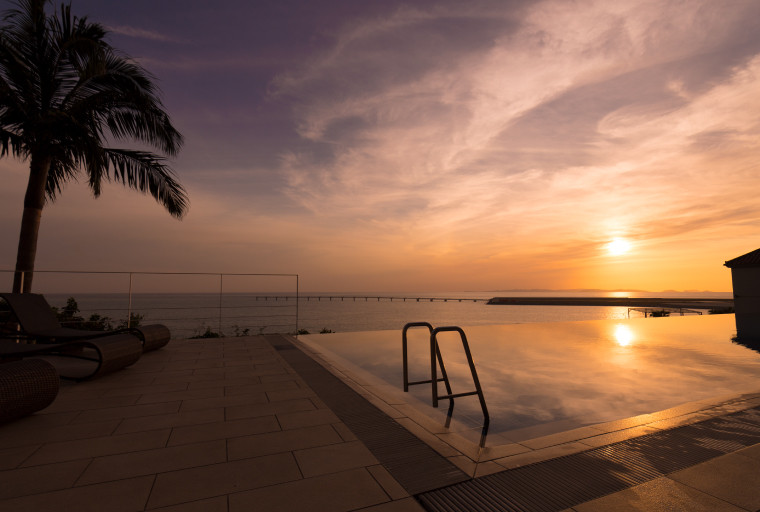 空と海に包まれるホテル自慢のインフィニティプールとなっております。目の前に広がる雄大な東シナ海と、まるで一体となった思える光景をご覧いただけます。昼間は那覇第二滑走路に離発着する飛行機の爽快な光景を、夕方は東シナ海の水平線に沈む壮大な夕陽をご覧いただけます。