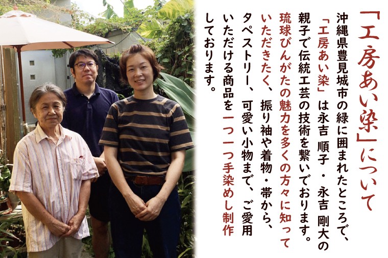 沖縄県豊見城市(とみぐすくし)の緑に囲まれたところで、工房あい染は永吉 順子 ・ 永吉 剛大の親子で伝統工芸の技術を繋いでおります。