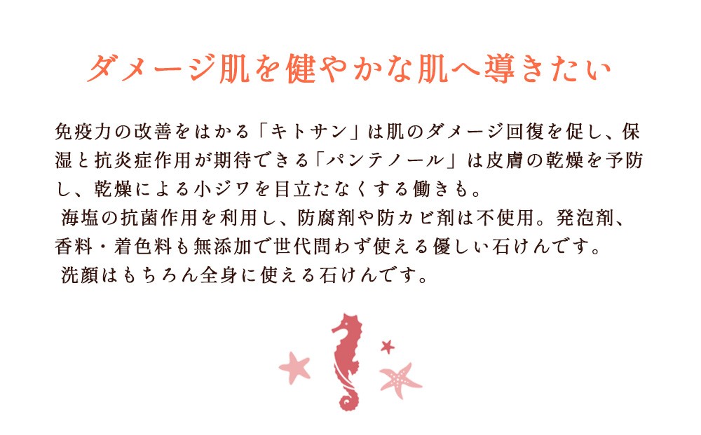 石鹸素地、海塩、ヒアルロン酸ナトリウム、D-パンテノール、キトサン