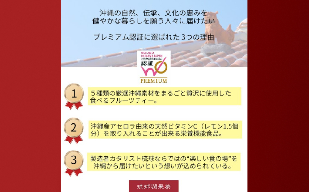 沖縄に行けなくても、沖縄を旅行したときのような、楽しいひと時をお過ごし頂ければと思い、新感覚【五感で沖縄体験して欲しい】「琉球潤果茶」を開発致しました。