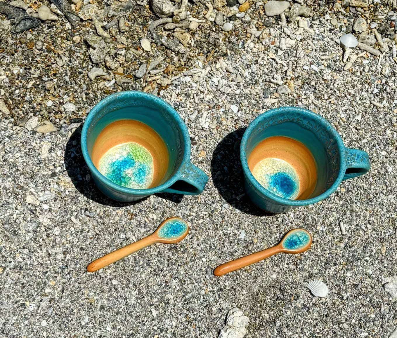 うるまブルーに琉球ガラスをあしらったマグカップ×2とスプーン2本のペアセット☆