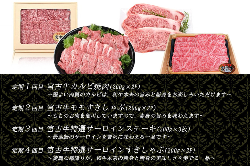 R121【定期便】【JA認定】宮古牛のカルビ焼肉・モモすきしゃぶ・特選サーロインステーキ・特選サーロインすきしゃぶ<定期便全4回>