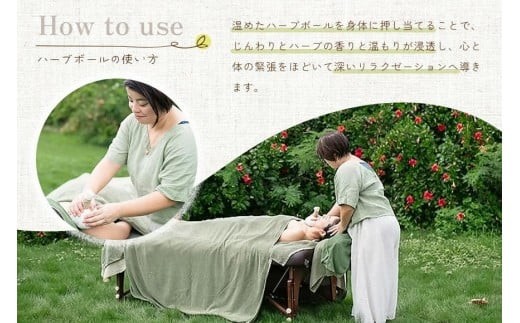 温めたハーブボールを身体に押し当てることで、じんわりとハーブの香りと温もりが浸透し、心と体の緊張をほどいて深いリラクゼーションへ導きます。