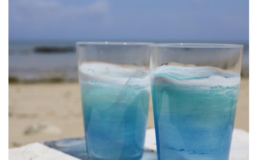 ガラス製のグラスにレジンでNANJOブルーの海を表現した作品です。