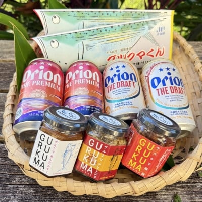 沖縄を代表するビールメーカー「オリオンビール」が贈る、限定醸造のザ・ドラフト プレミアムと、県産魚「グルクマ」を使った人気おつまみのセットです。