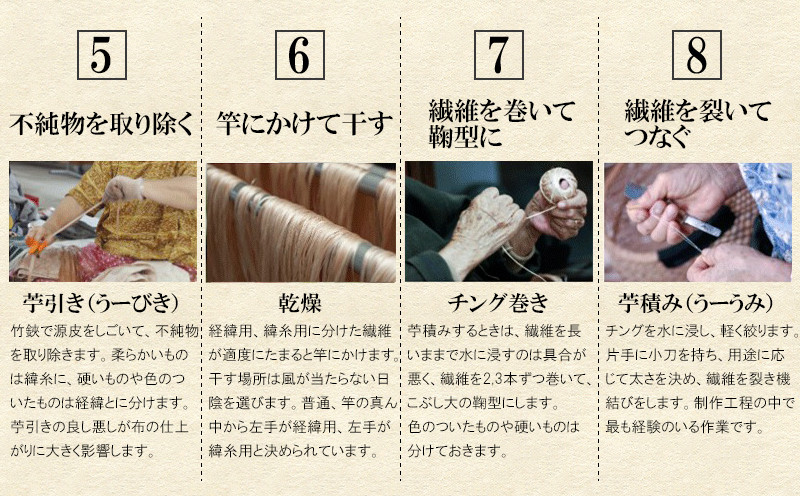 バナナ(実芭蕉)の仲間である糸芭蕉から採り出す糸は、あまりの繊細さゆえに極めて扱いが難しく、他の染織物にも増して、その工程を長く複雑なものにします。