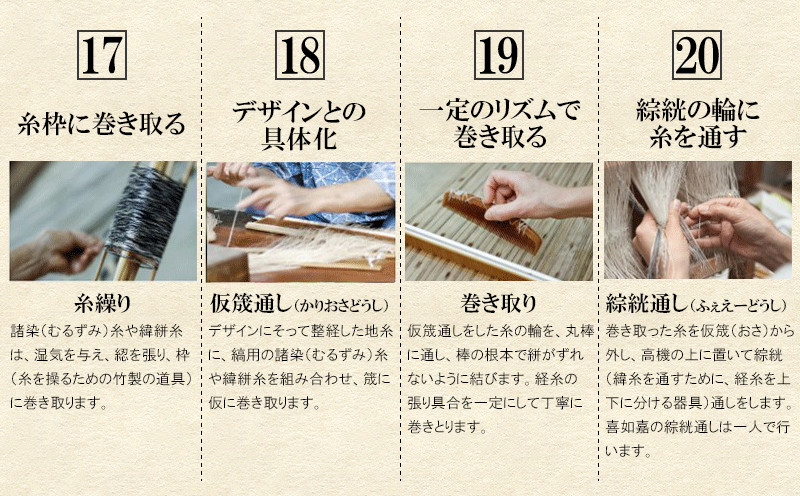 糸芭蕉を育てる畑仕事に始まり、原木を剥ぎ、繊維を採り出し、糸をつくり、撚りをかけ、絣を結び、染め、織り、仕上げまで。