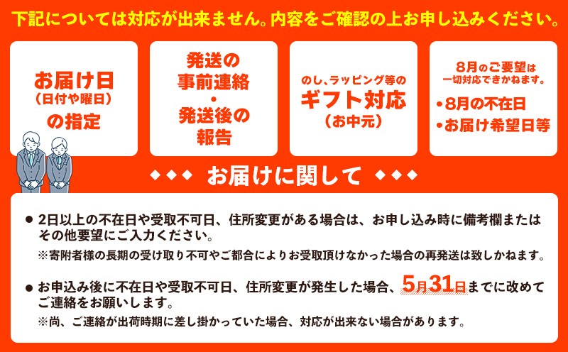 ・台風など天候や収穫状況によって発送できない場合もございます。その際は、来シーズンの発送や同寄附金額の別返礼品に変更など対応策を原則、電子メールにて申込時ご登録メールアドレス宛へさせていただきます。