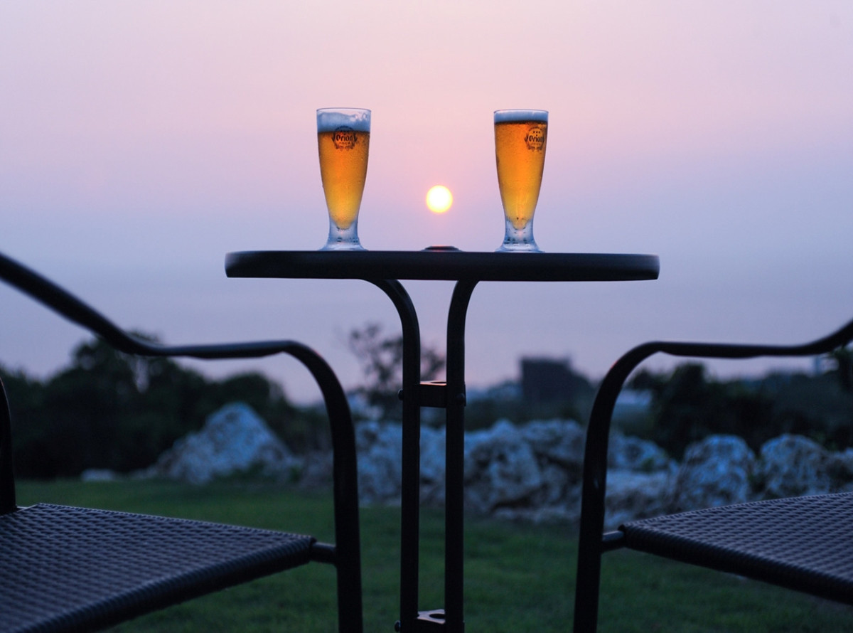 水盤に写りこむ夕焼け空と海に沈んでいく夕日が合わさった風景は、一度見たら忘れられないほど印象的。夜にはガーデンテラスから、漆黒の夜空に流れる銀河、きらめく星々をぜひご覧ください。