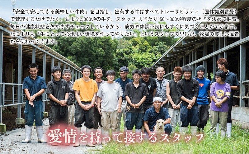 「安全で安心できる美味しい牛肉」を目指し、出荷する牛はすべてトレーサビリティ(固体識別番号)で管理するだけでなく、およそ2,000頭の牛を、スタッフ1人当たり150~300頭程度の担当を決めて飼育。毎日の健康状態を欠かさずチェックしているから、病気や体調不良にもすぐに気づくことができます。なによりも「牛にとって心地よい環境を作ってやりたい」というスタッフの思いが、牧場の美しい風景から伝わってきます。