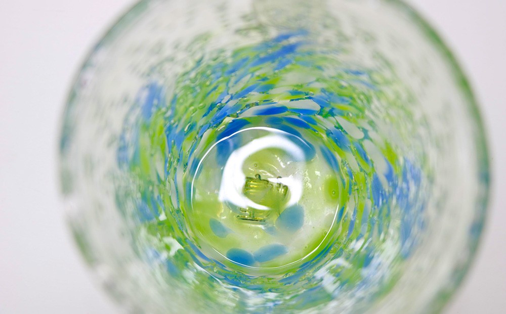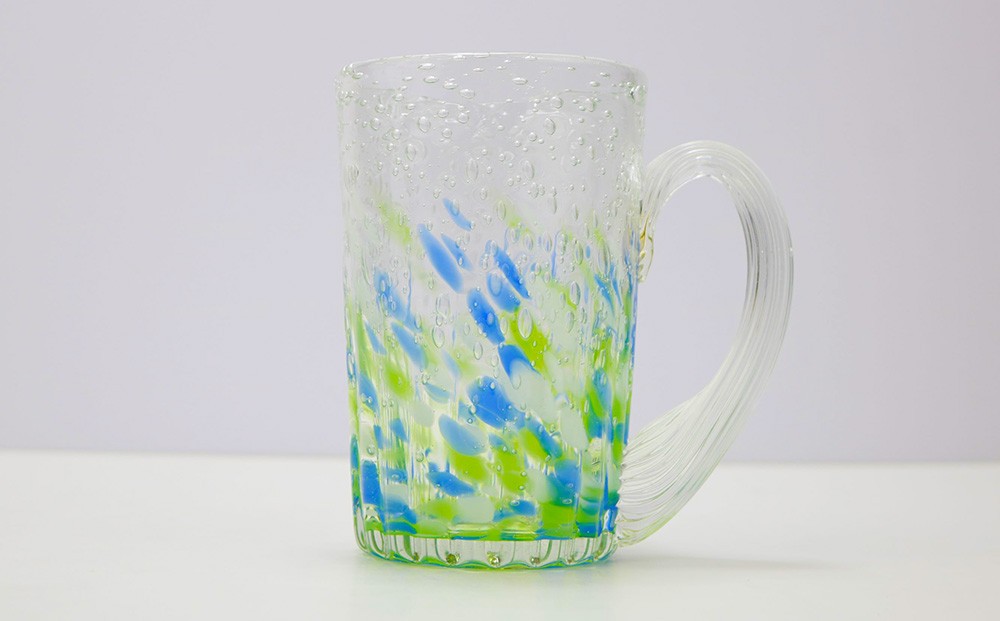 弾けるような大きな気泡とガラスの透明感が光を増し、沖縄の海を感じさせるグラスです。