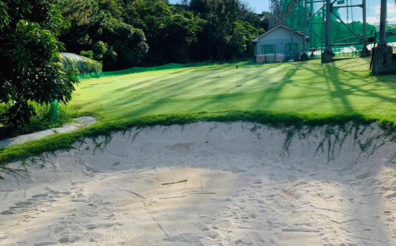 沖縄県国頭郡金武町にある、緑に囲まれた静かで開放的な練習場。180ヤードで35打席、バンカー・アプローチ練習場もご利用いただけます。クラブレンタルやコーチによる指導もあります。