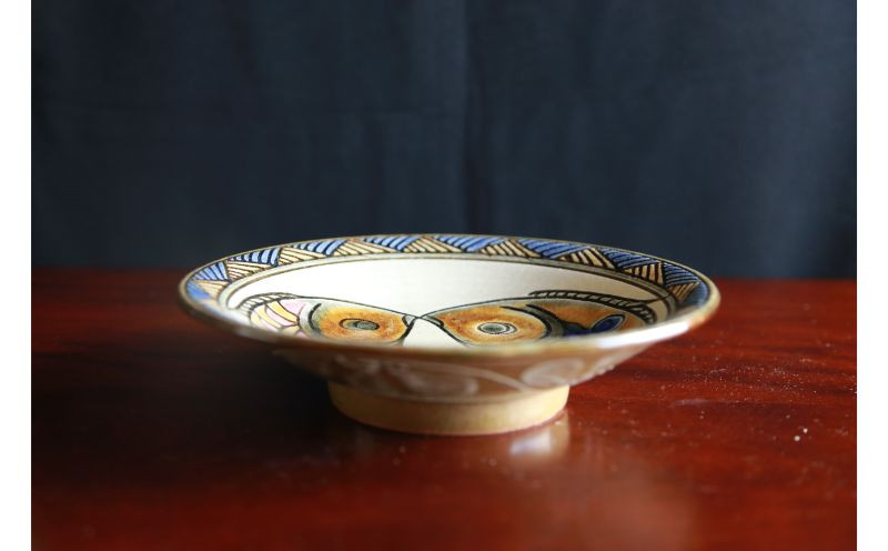 琉球陶器の独特な味わいと香奈子さんの作風である柔らかい柄付、色とりどりの絶妙な配色の作品が特徴です。伝統的な魚紋を継承しつつ、カメやクジラ、ジンベイザメといった多様な海の生き物、またハイビスカスや月桃など熱帯植物をモチーフに、女性らしい華やかさを陶器に託します。