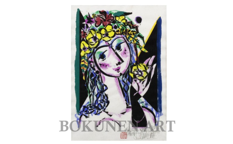 名嘉睦稔のオリジナル裏手彩色木版画作品「ゆうなの髪飾り」をお届けします。一点ずつ作家が着色した部数限定作品の中から1枚をお届けします。