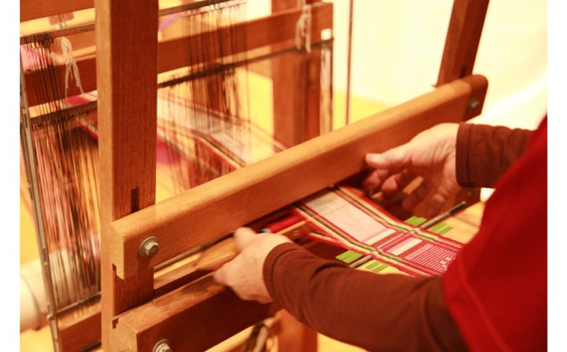 手花織は、手で色糸を縫い取るように模様を構成して織ります。
