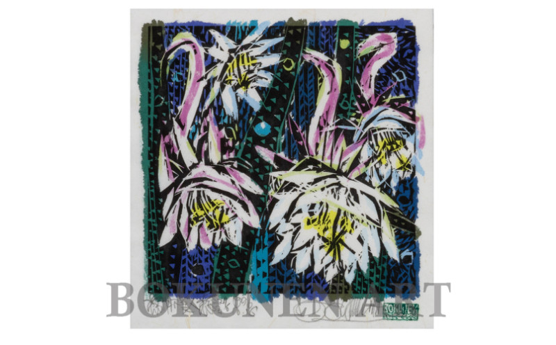 名嘉睦稔のオリジナル裏手彩色木版画作品「月下美人」をお届けします。一点ずつ作家が着色した部数限定作品の中から1枚をお届けします。