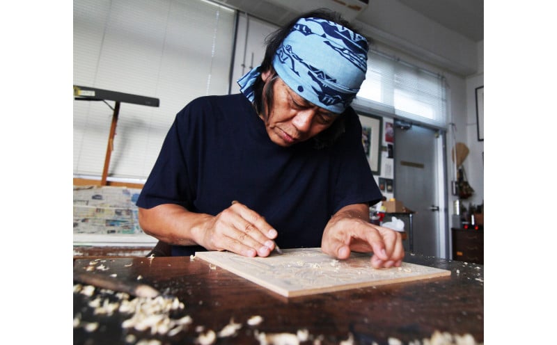 沖縄を代表する版画家・名嘉睦稔(ボクネン)は、「裏手彩色木版画」という手法を用いることで知られる作家です。