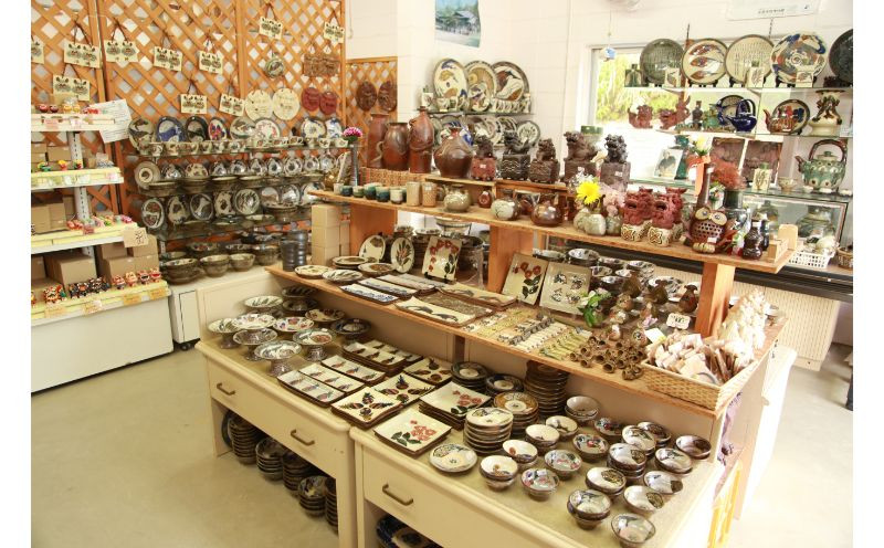 読谷村座喜味にある「やちむんの里」陶芸家が共同で活動する古風な工芸村で、様々な工房があり、作陶・販売を行っています。その一画にある「陶芸工房ふじ」。こちらの店舗では直接やちむんを購入できます。また、電子感謝券も利用できますので、読谷村にいらした際には是非お越しください。