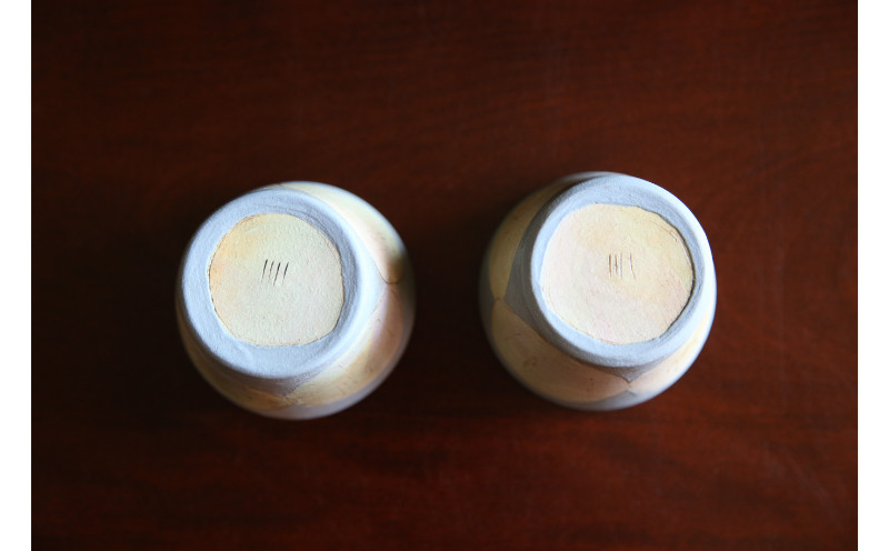 手びねり独特の大らかさや自由な色使いは、電照菊や南国フルーツといった沖縄での暮らしの中からアイデアが生まれると言います。縞模様のほか水玉や空や雲といったイラストを施した器もご用意しています。絵付けやデザインもひとつひとつ違った表情を持っていますが、それが世界に1つしかない個性にもなっています。