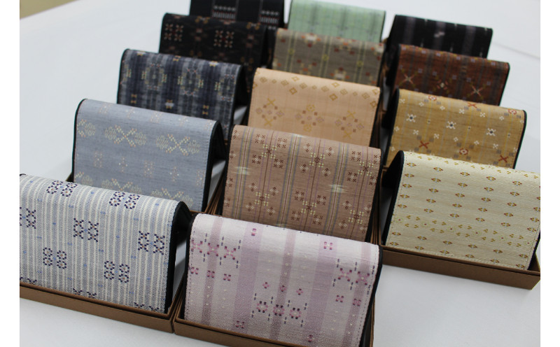 読谷山花織の名刺入れを1点お届けします。1つ1つ手織りなので、織り手によって色の組み合わせや花織のデザインは異なります。
