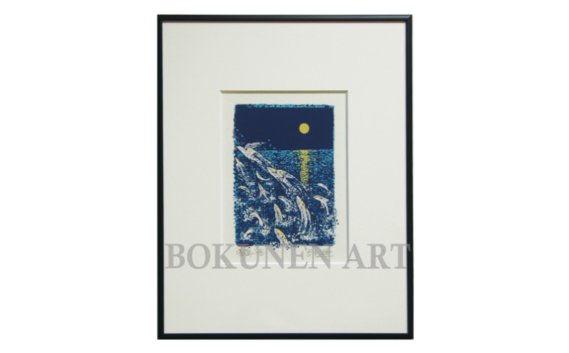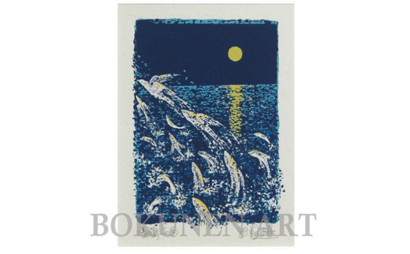 名嘉睦稔のセリグラフ作品「南ヌ島シリーズ4」をお届けします。南ヌ島シリーズは、続き絵になっており、並べてみると飛び跳ねる魚たちが鳥になり夜空を飛んで行く様子が描かれています。