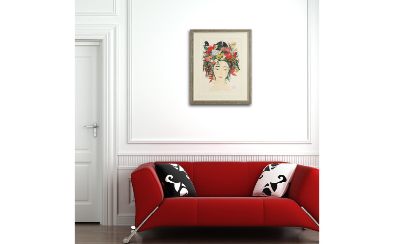 名嘉睦稔のオリジナル裏手彩色木版画作品「ゆうなの髪飾り」をお届けします。一点ずつ作家が着色した部数限定作品の中から1枚をお届けします。