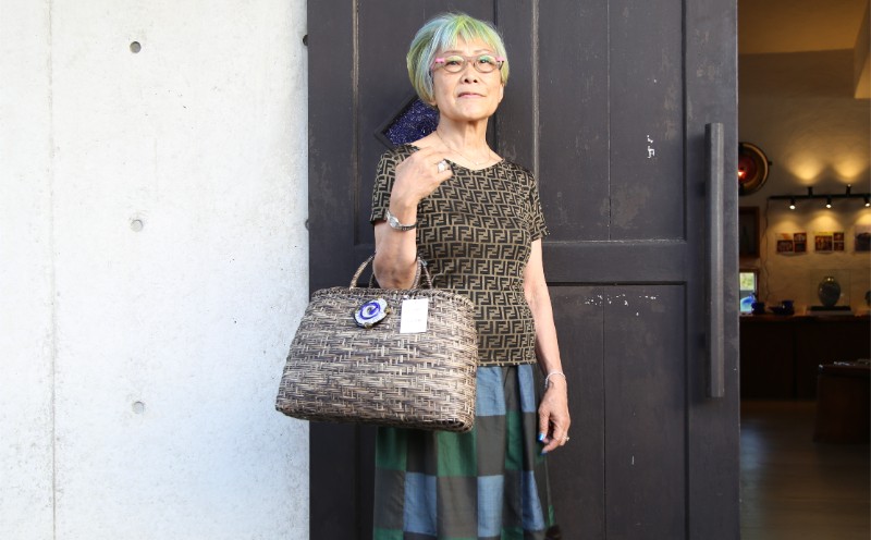 琉球王朝時代から民具作りに使用されていた沖縄固有の蔓性の植物クージ(トウツルモドキ)を用い、流れ網代編みで、日本の象徴”富士山”をイメージしたシルエットを表現し、FUJIと銘々。前面に配したのは稲嶺盛一郎氏が手がける琉球ガラスという異素材の組み合わせは、独自性、新規性に富み世界でも類をみないカゴバッグです。