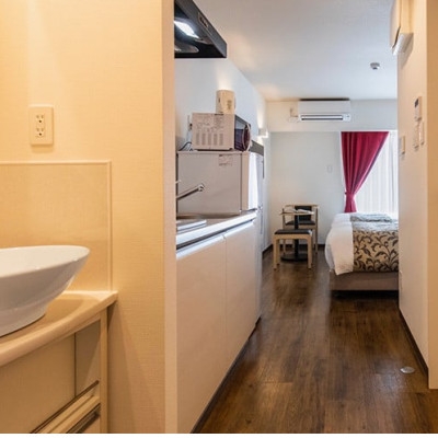 お部屋は一般的なホテルより広々とした造りで、長期滞在にも嬉しい充実の設備をご用意しています。