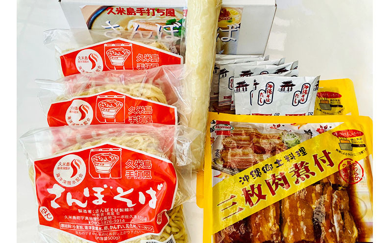 久米島手打風『さんぼそば』生麵6食セットは、メインのそばに加え、沖縄そばに欠かせない三枚肉の煮付け、揚げかまぼこ、そばだしがセットになっています。