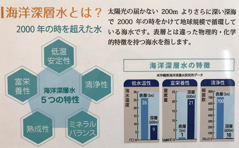 久米島海洋深層水は、二千年という長い年月をかけて地球全体を循環し続けるため、細菌数が少なく近代化での汚染物質の影響を受けることなく清浄性に優れた水です。