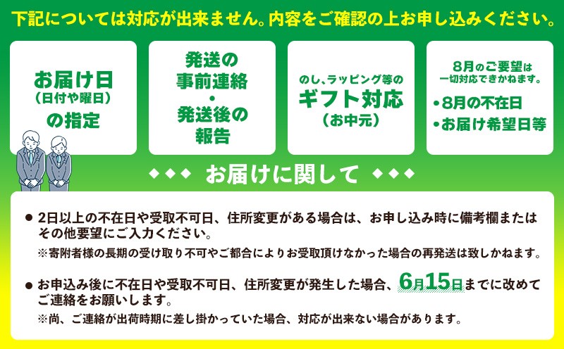 ・台風など天候や収穫状況によって発送できない場合もございます。その際は、来シーズンの発送や同寄附金額の別返礼品に変更など対応策を原則、電子メールにて申込時ご登録メールアドレス宛へさせていただきます。