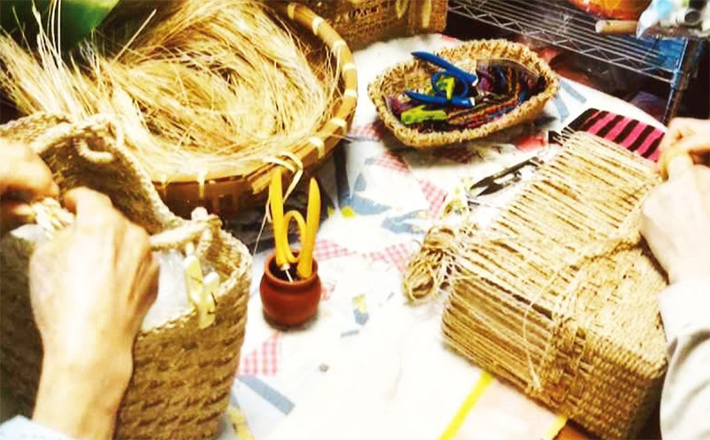 月桃の茎を乾燥させて、細く裂いたものから糸をつくる工程は、非常に細かい作業が多く、1つのバックを完成させるまでに1ヶ月程かかる貴重な作品。