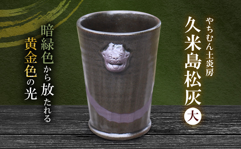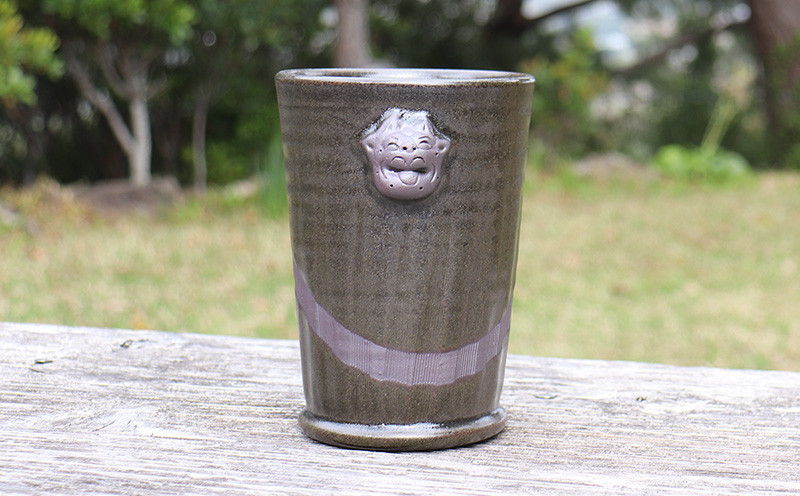 暗緑色から放たれる黄金色の光 久米島松灰 シーサー付フリーカップ(大) SDGs やちむん 焼き物 陶器 やちむん土炎房 釉薬 上薬 松 リュウキュウマツ 琉球松 自然 利活用 窯出し 一点もの 風合い 深み 土 粘土 素地 こだわり