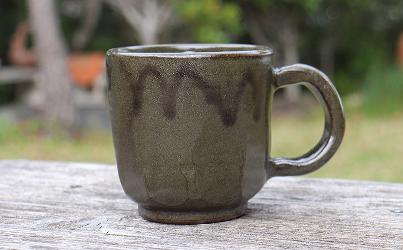 暗緑色から放たれる黄金色の光 久米島松灰 マグカップ SDGs やちむん 焼き物 陶器 やちむん土炎房 釉薬 上薬 松 リュウキュウマツ 琉球松 自然 利活用 窯出し 一点もの 風合い 深み 土 粘土 素地 こだわり