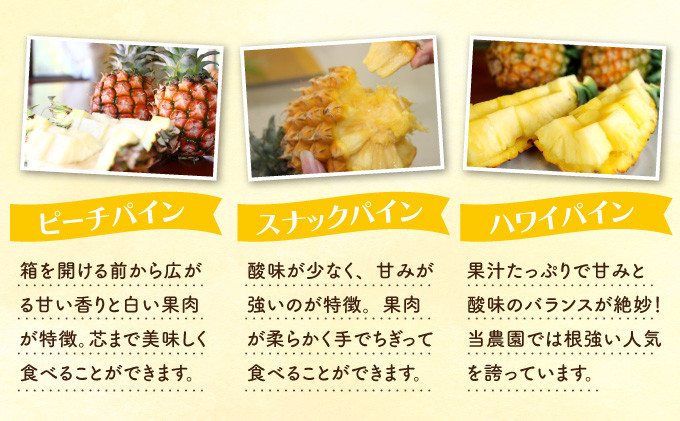 | 容量 | パイナップル・マンゴー定期便(4月下旬~8月下旬かけて計5回) スナックパイン約3kg(3~6玉) ピーチパイン約3kg(3~6玉) アップルマンゴー約1kg(2~3玉) ハワイパイン約4kg(2~4玉) キーツマンゴー約1.8kg (2~3玉) それぞれ最も美味しい時期にお送り致します。 ※品種・玉数の指定は承れません ※天候により収穫時期が早まり、同月(上旬・下旬など)に2回お届けする可能性もございますので、ご了承下さい。 |