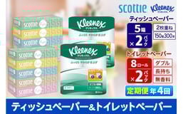 《3ヶ月ごとに4回お届け》定期便 クリネックス トイレットペーパー 長持ちロール ダブル 8ロール×2パック & ティッシュペーパー スコッティ ファン 150組 5箱×2パック 秋田市オリジナル 新生活 [トイレットペーパー ティッシュ ボックスティッシュ]