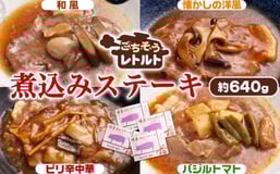 No.257 ごちそうレトルト 煮込みステーキ 約640g / 惣菜 レトルト食品 肉料理 豚肉 簡単 手軽 湯煎 贅沢 キャンプ アウトドア 美味しい 選べる 和風 洋風 中華 バジルトマト 千葉県