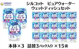 シルコット ピュアウォーター ウェットティッシュセット(本体3+詰替3P×15袋) 純水99% 手口拭き 口周り 肌にやさしい 厚手 やわらかシート 拭き取り 手拭き